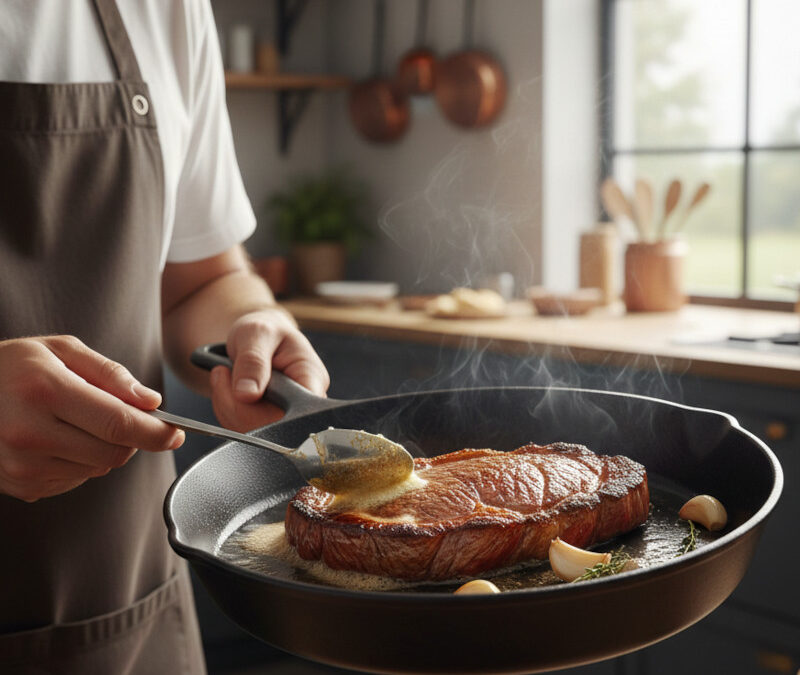 Le beurre va mousser doucement. Arrosez votre steak à la cuillère. La température plus basse empêchera le beurre de brûler, évitant ainsi le « nuage » final si redouté.