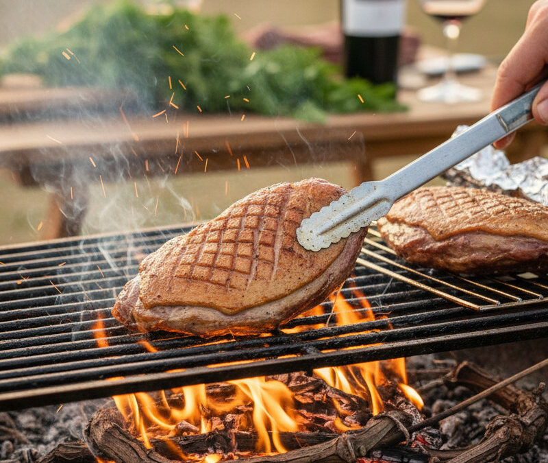 Barbecue classique : Ne placez jamais le magret directement au-dessus des flammes (le gras qui coule crée des appels de feu). Utilisez la cuisson indirecte.