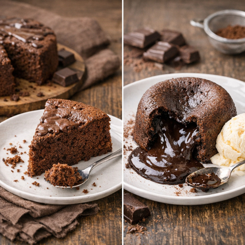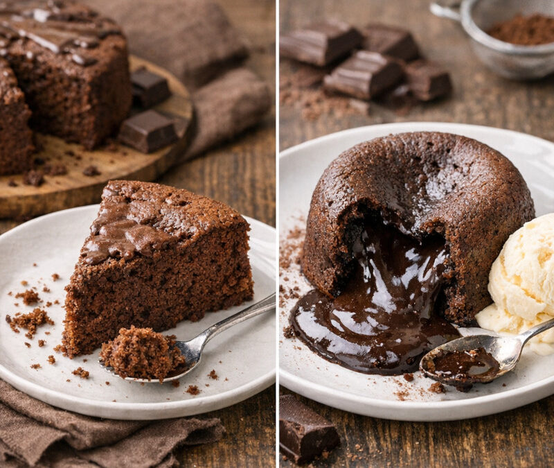 L’aspect visuel : Le moelleux est gonflé, avec une croûte mate. Le fondant est plus bas, souvent brillant et craquelé. Le coulant est souvent servi individuellement (moule à ramequin) car il est trop fragile pour être découpé en grandes parts.