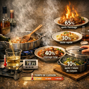 | L’alcool ne prend pas feu | Alcool trop froid ou pas assez de vapeurs | Chauffer légèrement l’alcool avant, bien saisir les aliments |