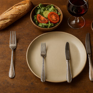 L’Assiette à Pain : Elle est cruciale. Placée en haut à gauche des assiettes principales, elle ne doit jamais être trop grande. Le beurre, s’il est servi, doit être sur cette assiette avec son propre petit couteau.