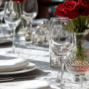 L’Ordre des Vins : Les verres sont disposés dans l’ordre de service : le vin blanc (petit) est à l’extérieur, le vin rouge (grand) est au centre, et le verre à eau (le plus grand) est le plus à gauche ou en tête de ligne.