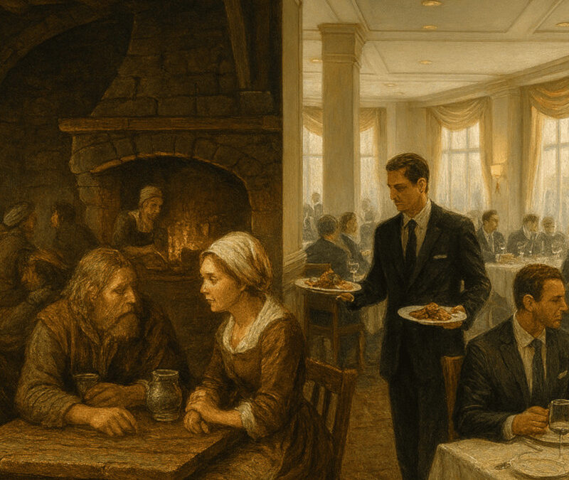 Ce voyage historique nous mène à travers plusieurs siècles de transformation, où l’hospitalité est passée d’un besoin de subsistance à un véritable art du service.