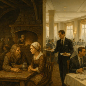 L’invention du menu : comme on ne voit plus les plats à l’avance, il faut les lister. Le menu moderne est né de ce besoin de savoir ce qui va sortir de la cuisine.