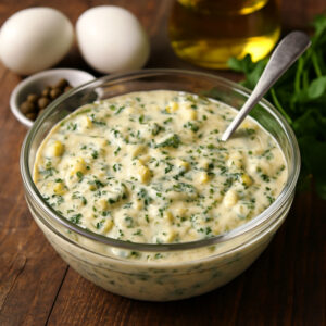 La sauce gribiche est une sauce froide, émulsionnée à base de jaune d’œuf dur (contrairement à la mayonnaise, qui utilise un jaune d’œuf cru). Elle appartient à la famille des sauces mères (Lien vers votre article sur les sauces mères) dérivées de la mayonnaise, mais son profil est beaucoup plus agressif et prononcé.