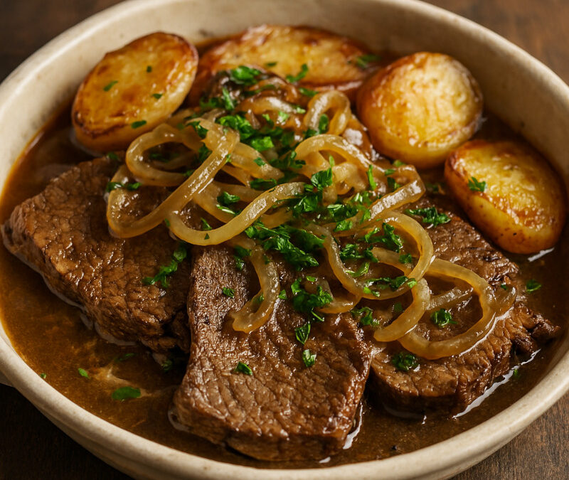 Variante : Après avoir réalisé la sauce aux oignons et au bouillon, on ajoute des cornichons coupés en rondelles et des câpres. Ces éléments amplifient l’acidité et le piquant, contrastant merveilleusement avec la richesse du bœuf.