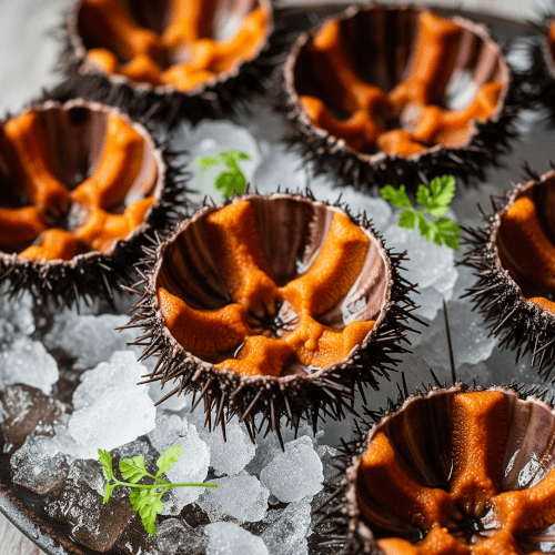 ![]() | Oursin | Échinoderme | Décembre à mars | Saveur très fine et délicate, avec des notes de noisette. Texture crémeuse et onctueuse. | Cru, ouvert en deux et dégusté à la cuillère. | Vin blanc sec (Pouilly-Fumé), Champagne. |