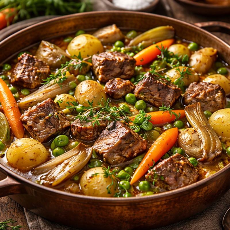 Ce ragoût printanier est un monument de la cuisine bourgeoise, un équilibre parfait entre la tendreté de la viande jeune et le croquant des légumes primeurs.