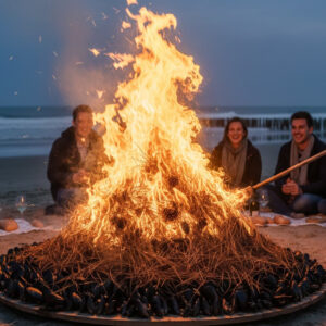 L’éclade de moules (ou éguillade) : Typique de l’île d’Oléron. Les moules sont disposées en spirale sur une planche de bois et recouvertes d’aiguilles de pin auxquelles on met le feu. Le goût fumé est incomparable.