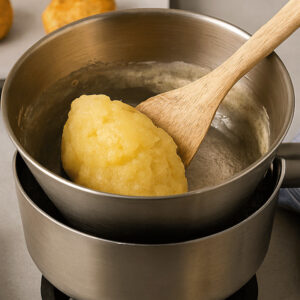 Le mélange ne doit jamais bouillir ni même frémir. Il doit ressembler à une crème épaisse et brillante, où les « grumeaux » sont minuscules et fondent presque en bouche.