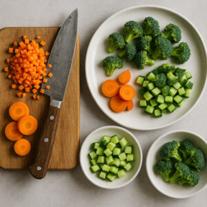 Méthode : La Brunoise est directement dérivée de la Julienne. Prenez les bâtonnets de Julienne, alignez-les, et coupez-les à nouveau en travers pour former de petits dés uniformes.