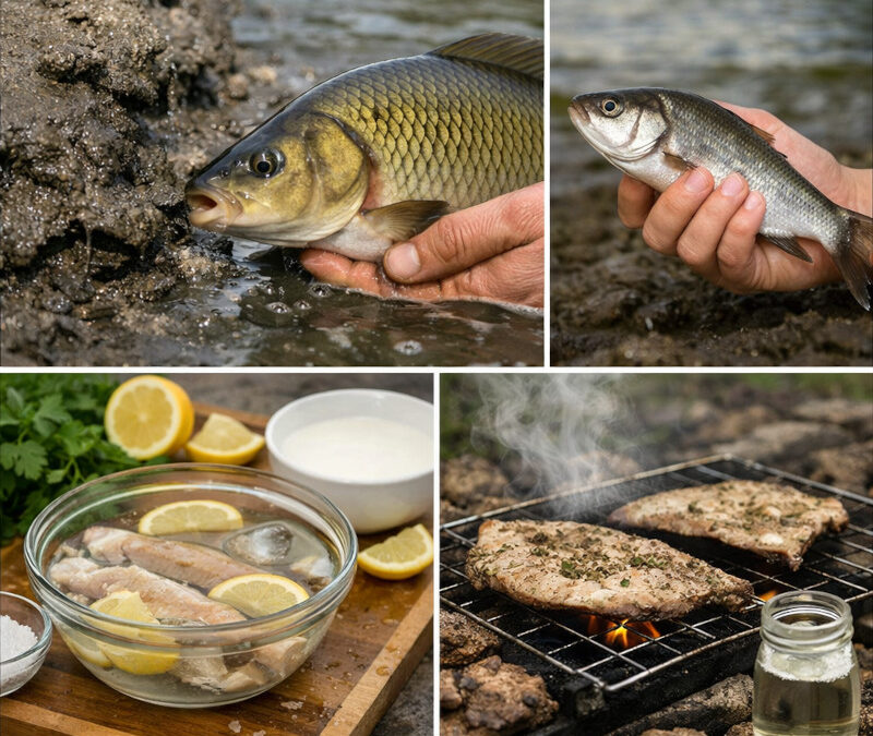 Le vinaigre ou le citron : Préparez une solution d’eau très froide additionnée de vinaigre blanc ou de jus de citron. Laissez le poisson entier (vidé) ou les filets tremper pendant 20 à 30 minutes. L’acide casse la structure moléculaire de la géosmine.