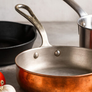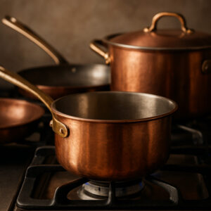 L’Étain ou l’Inox : Pour cette raison, les ustensiles de cuisine en cuivre sont toujours doublés à l’intérieur d’une fine couche d’étain (traditionnel) ou d’acier inoxydable (moderne, plus durable). Le cuivre sert uniquement de conducteur de chaleur, et la doublure sert de surface de cuisson.